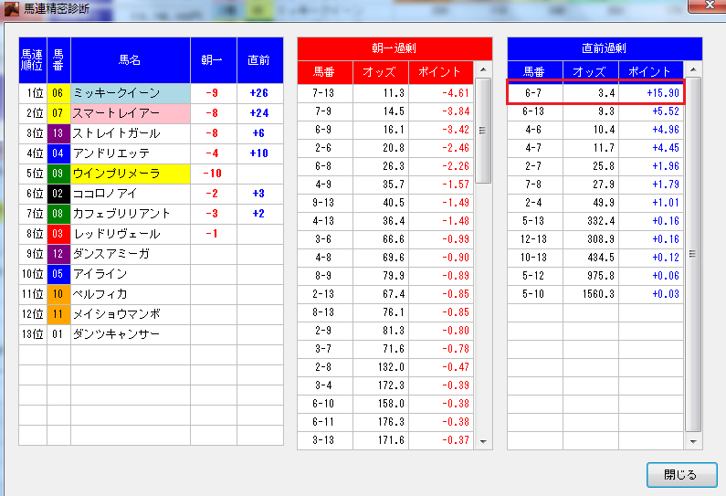 ↓締め切り5分前のオッズ断層表