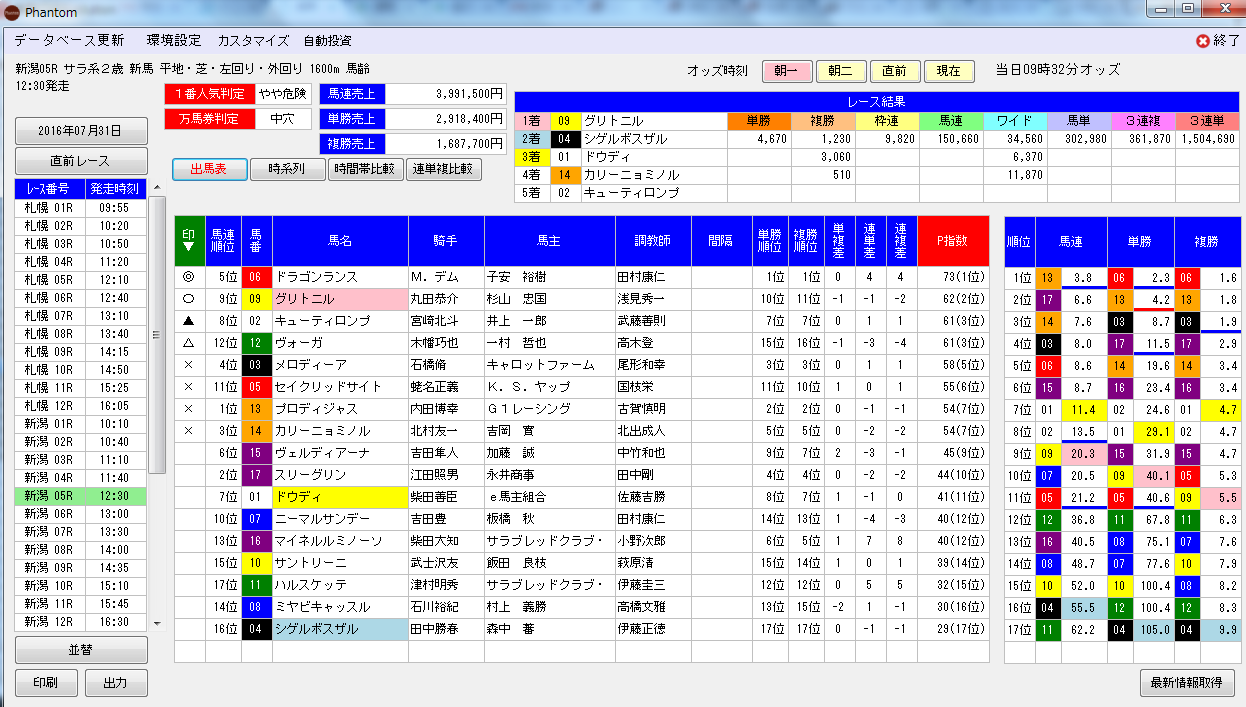 更にこのレースで注目したいのが、11番人気1着に激走した⑨グリトニルがPHANTOMのP指数でも2位(朝一)と非常に高かった点です。