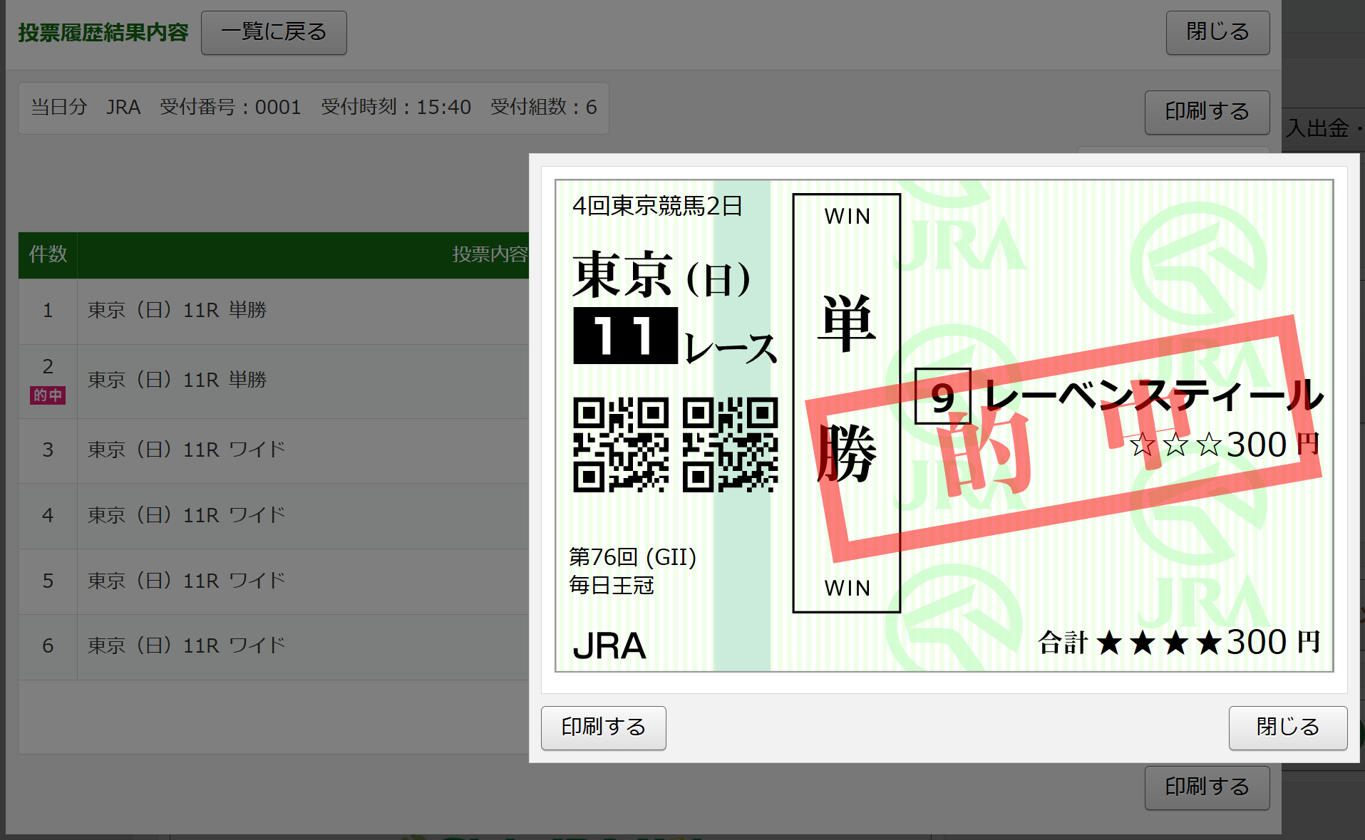 個人的にはこのレースの馬券を1000円分買っていたので、うち単勝300円分が的中となっていました。