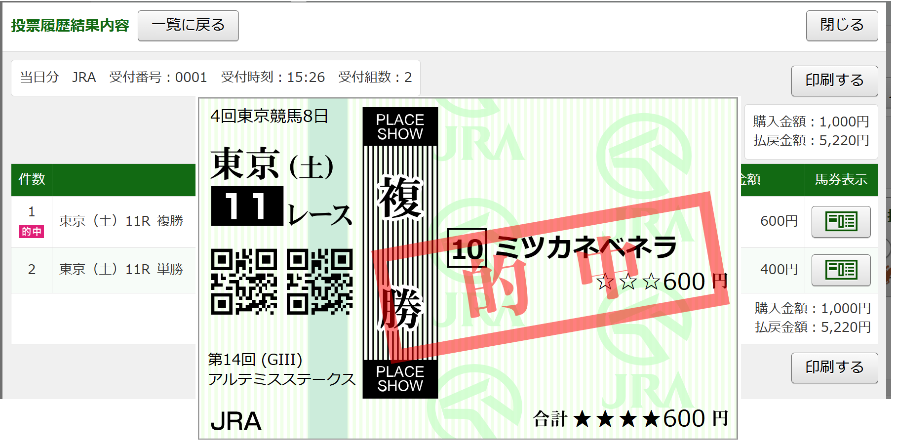 単勝でこっそり狙っていた馬もいましたが、そちらは不的中。それでも1000円分買って5220円が返ってきましたので御の字ですね。