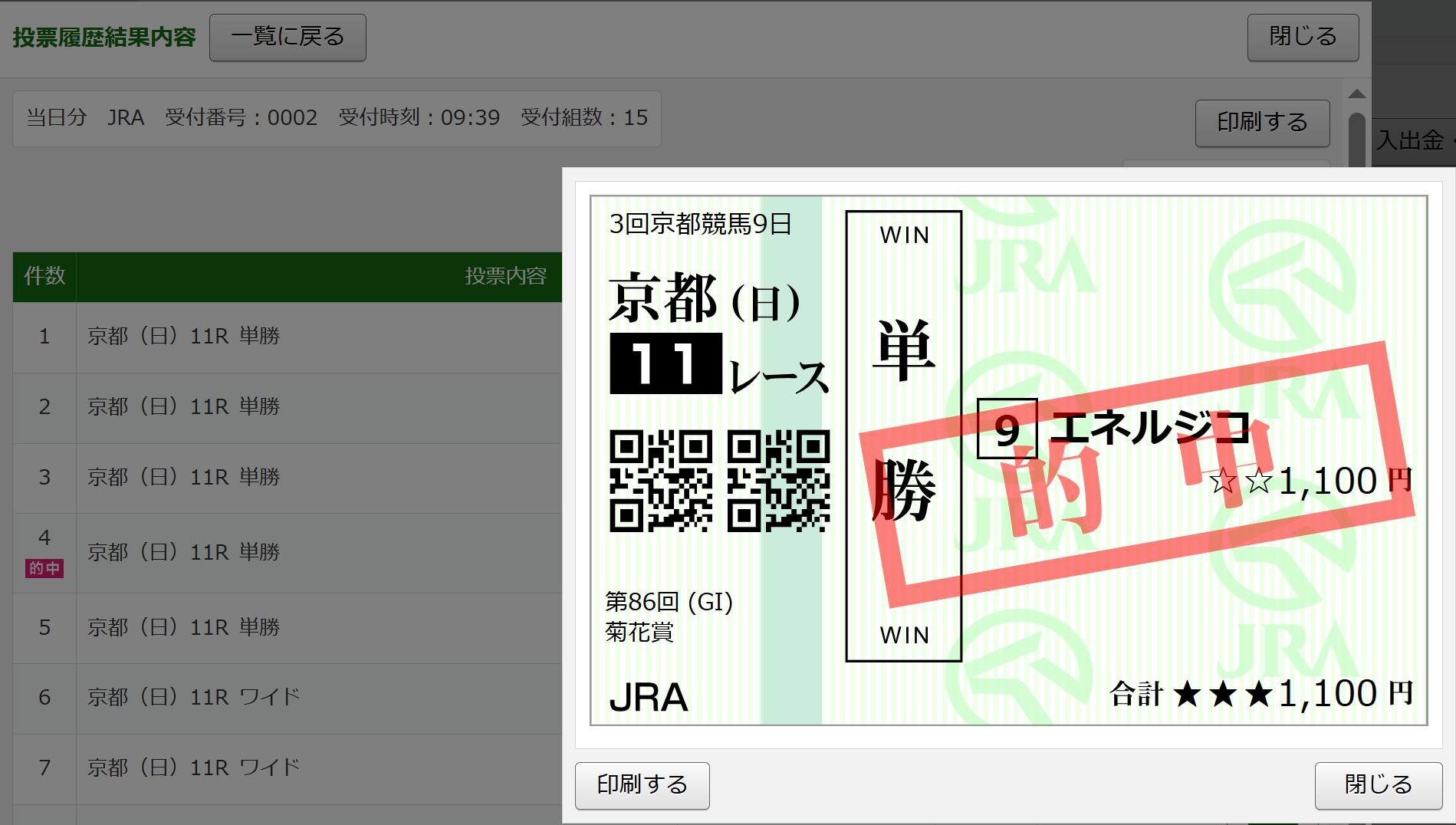 この秋のG1ではスプリンターズステークスを的中(単勝5000円)→秋華賞を不的中という流れで菊花賞を迎えました。菊花賞では3頭の該当馬が選出され、そのうちの1頭エネルジコが優勝しての単勝380円的中でした。