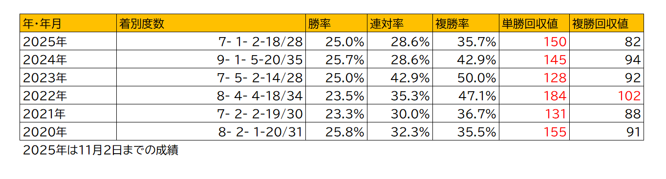 この4ステップで導き出された軸馬の成績が以下の通り、2020年以降で単勝回収値150円複勝回収値92円を達成しています。