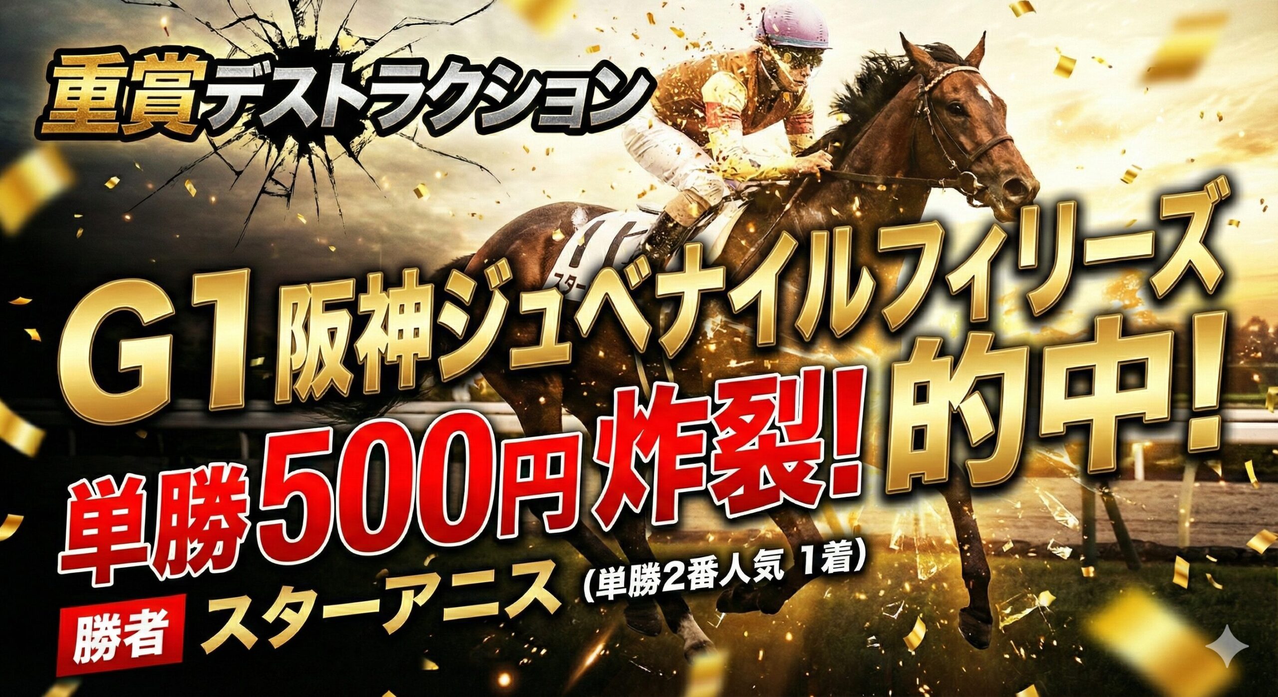 今年の秋のG1はG1-DESTRACTIONが的中しまくっていますね。阪神ジュベナイルフィリーズは単勝2番人気スターアニスを選出して単勝500円の的中。