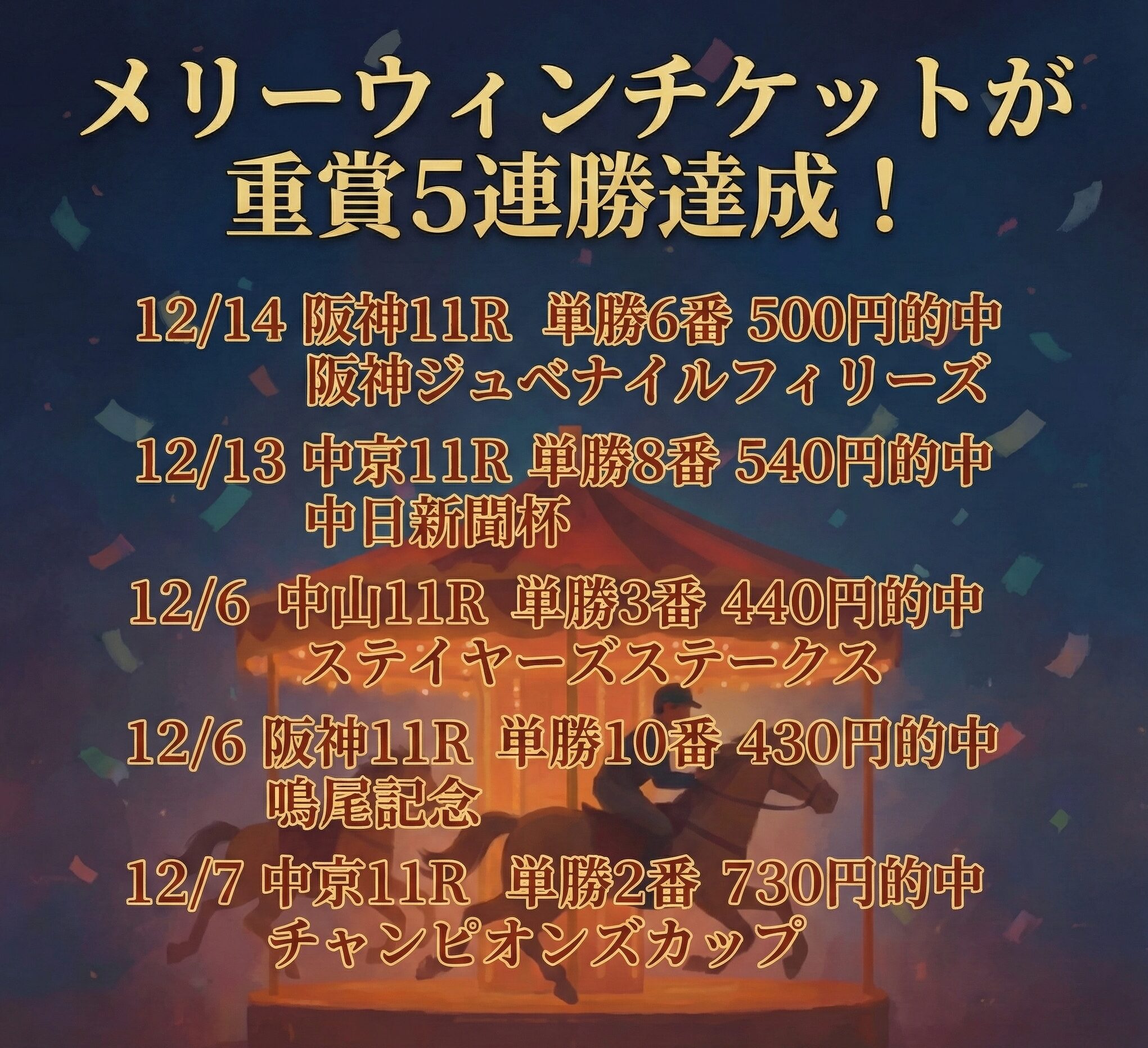 メリーウィンチケットが先週の阪神ジュベナイルフィリーズを的中させて重賞レース5連勝を達成したとのことです。