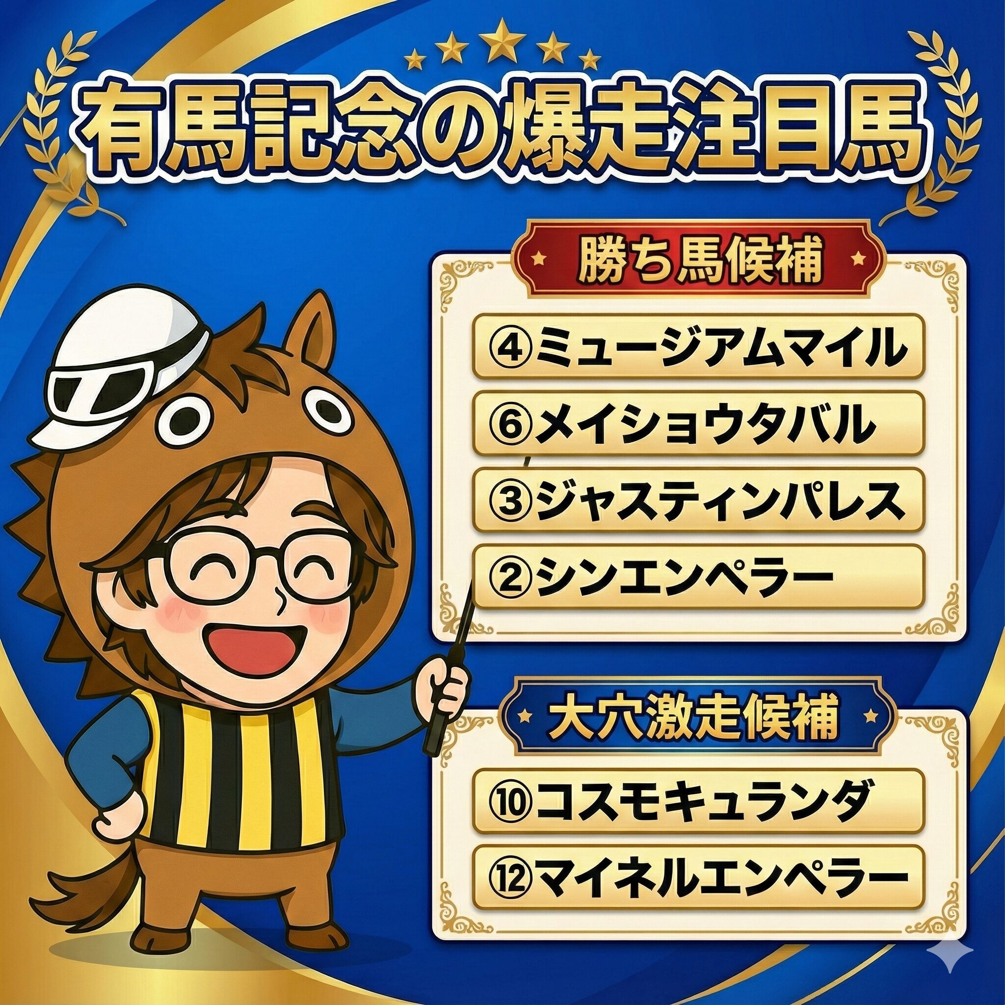 GOKU重は当サイト経由での商材購入特典としても配布していましたが、そんなに該当馬が毎週出現するようなロジックでもなく、だからこそ今回の有馬記念のような人気薄該当馬の激走には警戒したいところです。今回は勝ち馬ミュージアムマイルと12番人気2着コスモキュランダをズバリ選出していました。