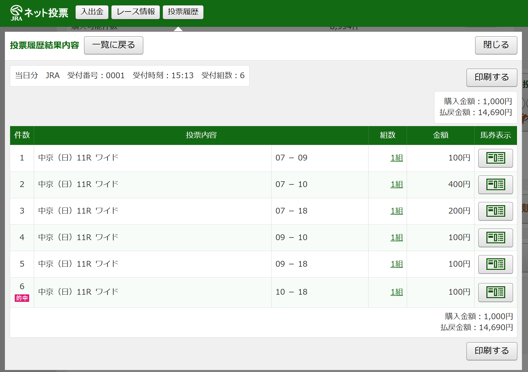 わずか1点で単勝27.6倍を的中できたわけですが、このレースではミラクルコード1999の選出馬や血統面でねらい目だった馬など個人的に4頭を抽出していましたので、ワイドボックス買いをチョイスしました。