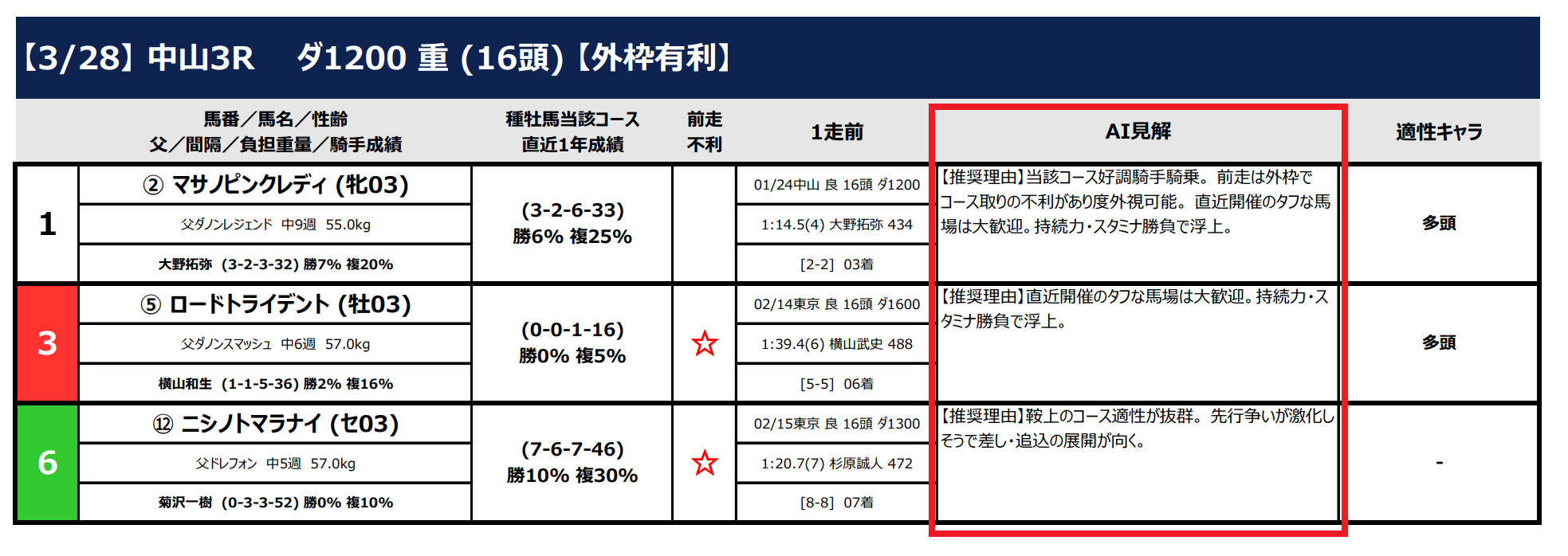 このレースでは②マサノピンクレディが1着(単勝780円)で⑤ロードトライデントが3着でしたが、様々な加点ポイントからコメントが表示される仕組みで、減点ポイントがある場合にはマイナスポイントについても表示します。