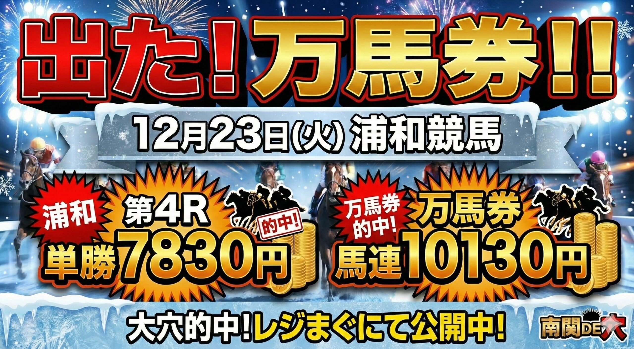 南関DE穴が12月23日(火)に馬連万馬券的中させていた! 公開日:2025年12月26日 南関DE穴 いやいや、あれだけ「南関DE穴は対象レースが少ないレースで!」って言ってたのに、12月23日(火)の浦和開催を見逃してしまいました。。 続きを読む