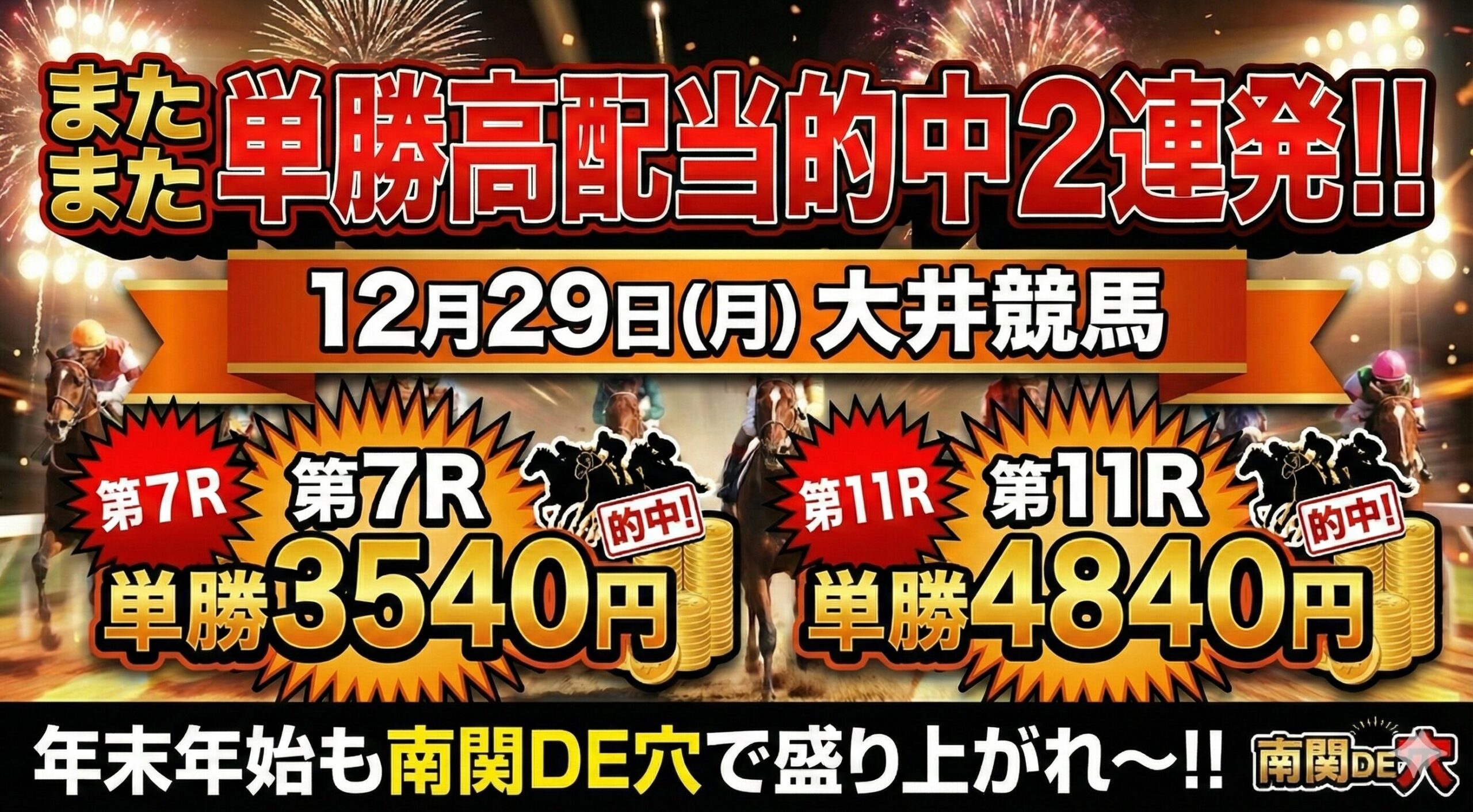 南関DE穴が東京大賞典前の大井第7Rで単勝3540円を的中!さらに高配当的中も出現。